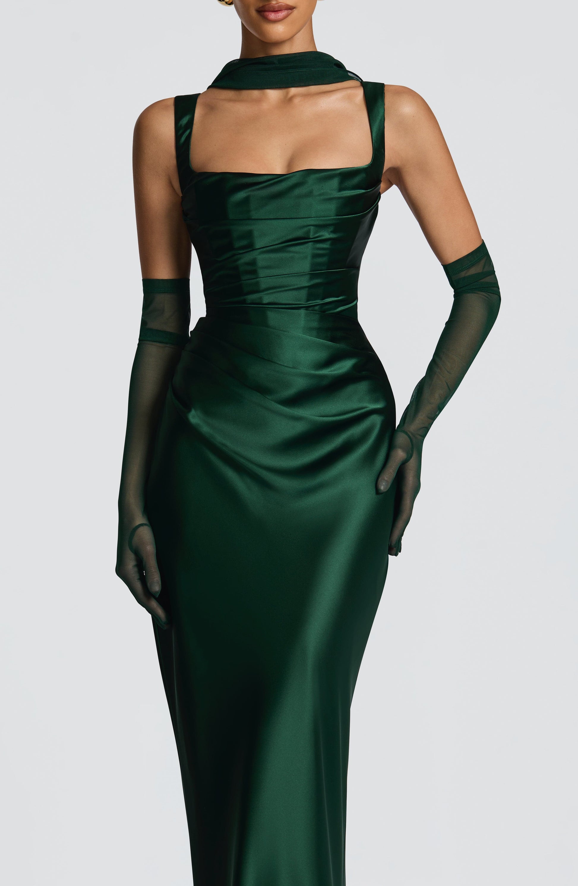 El vestido largo Calanthe en color esmeralda presenta un lujoso acabado satinado con un escote cuadrado adornado con elegantes detalles plisados. Los pliegues asimétricos en el corpiño y los tirantes cónicos crean una silueta refinada, mientras que la espalda con cordones añade un toque delicado y sofisticado.