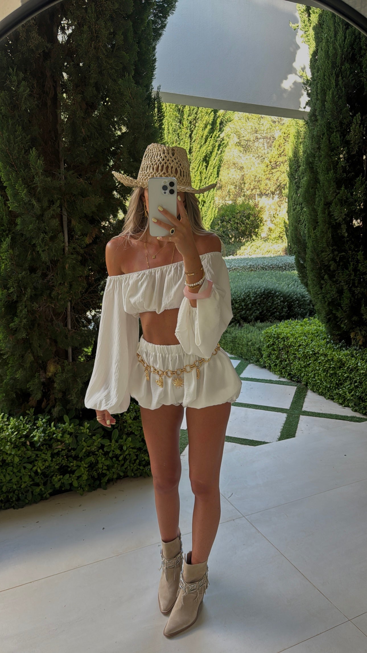 El Conjunto Chloe Bloomers en Marfil de SOFIACALDERON es una pieza luminosa y sofisticada que captura la esencia del verano mediterráneo. El top de hombros descubiertos con mangas largas y volumen suave crea un efecto romántico y femenino, mientras que su corte cropped aporta equilibrio y frescura al look.