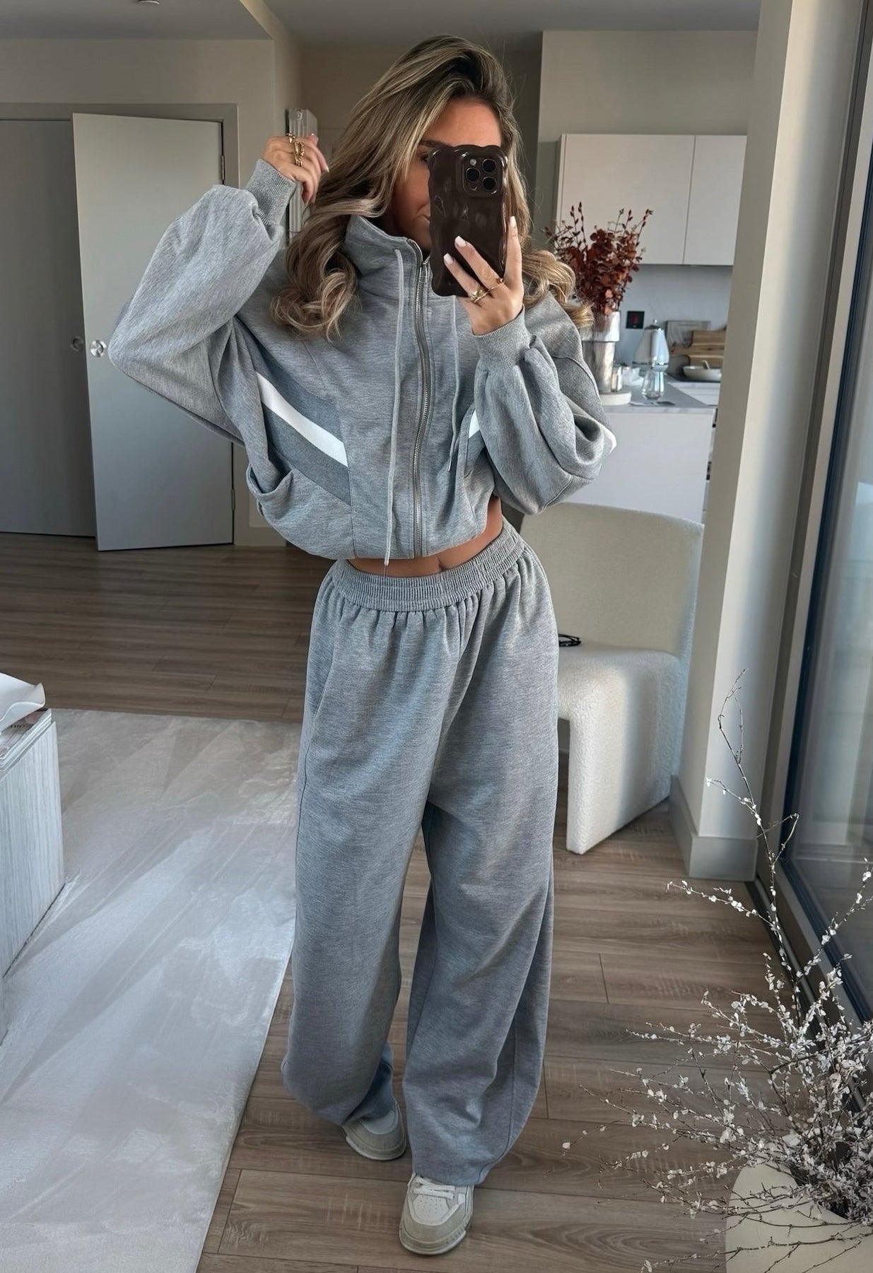 Con un ajuste relajado y tejido suave, esta chaqueta ofrece comodidad absoluta sin renunciar al estilo. El cierre frontal y los acabados cuidados la convierten en una pieza versátil, perfecta para combinar con joggers a juego, leggings o denim.