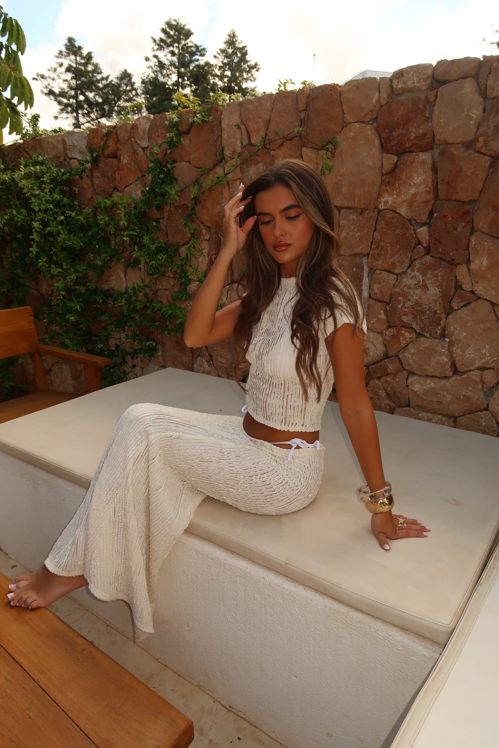 Su caída fluida y su ajuste cómodo crean un movimiento delicado al caminar, convirtiéndola en una opción ideal para looks de verano, escapadas vacacionales o planes especiales al atardecer. El tono marfil potencia la luminosidad y aporta una sensación fresca y refinada.
