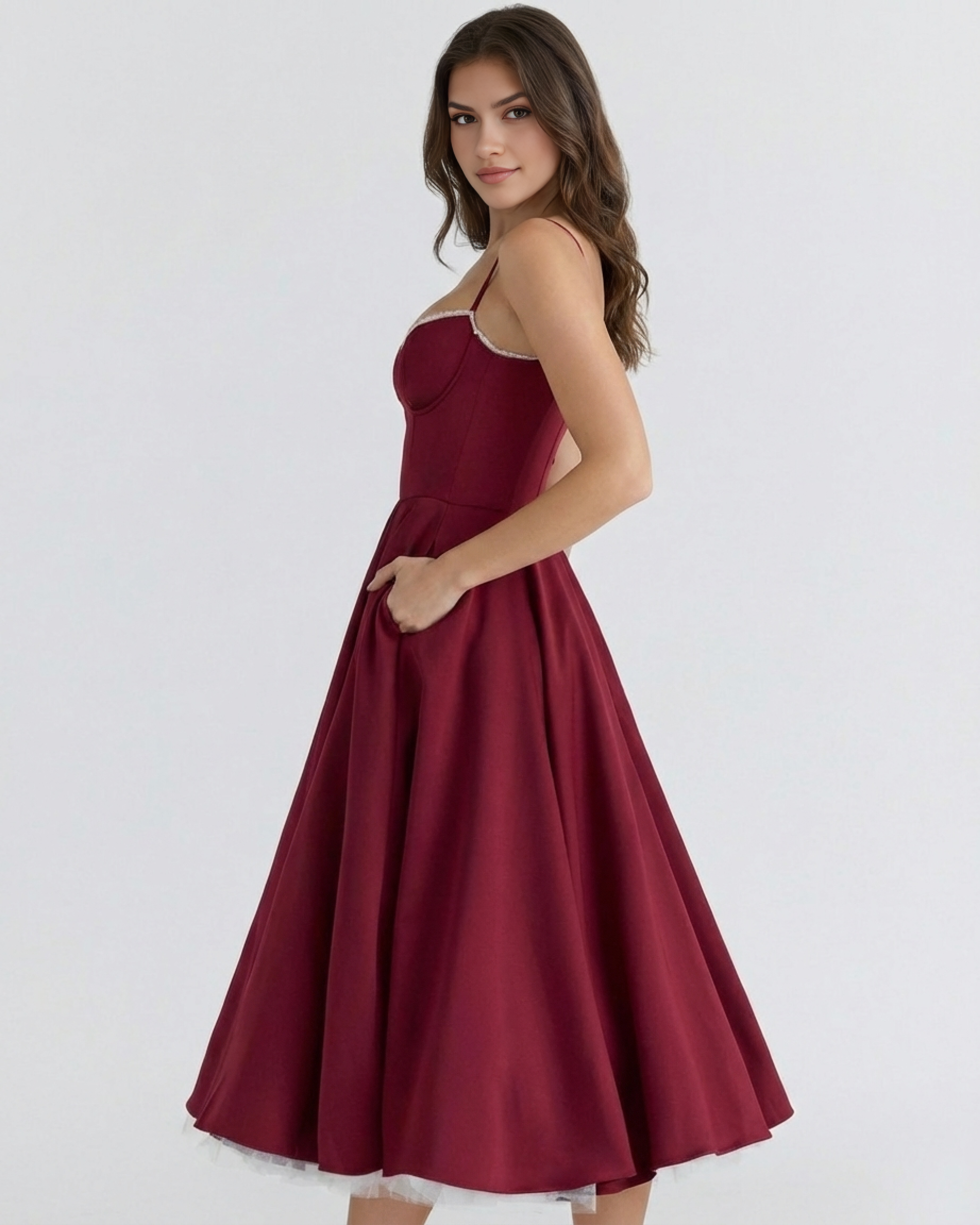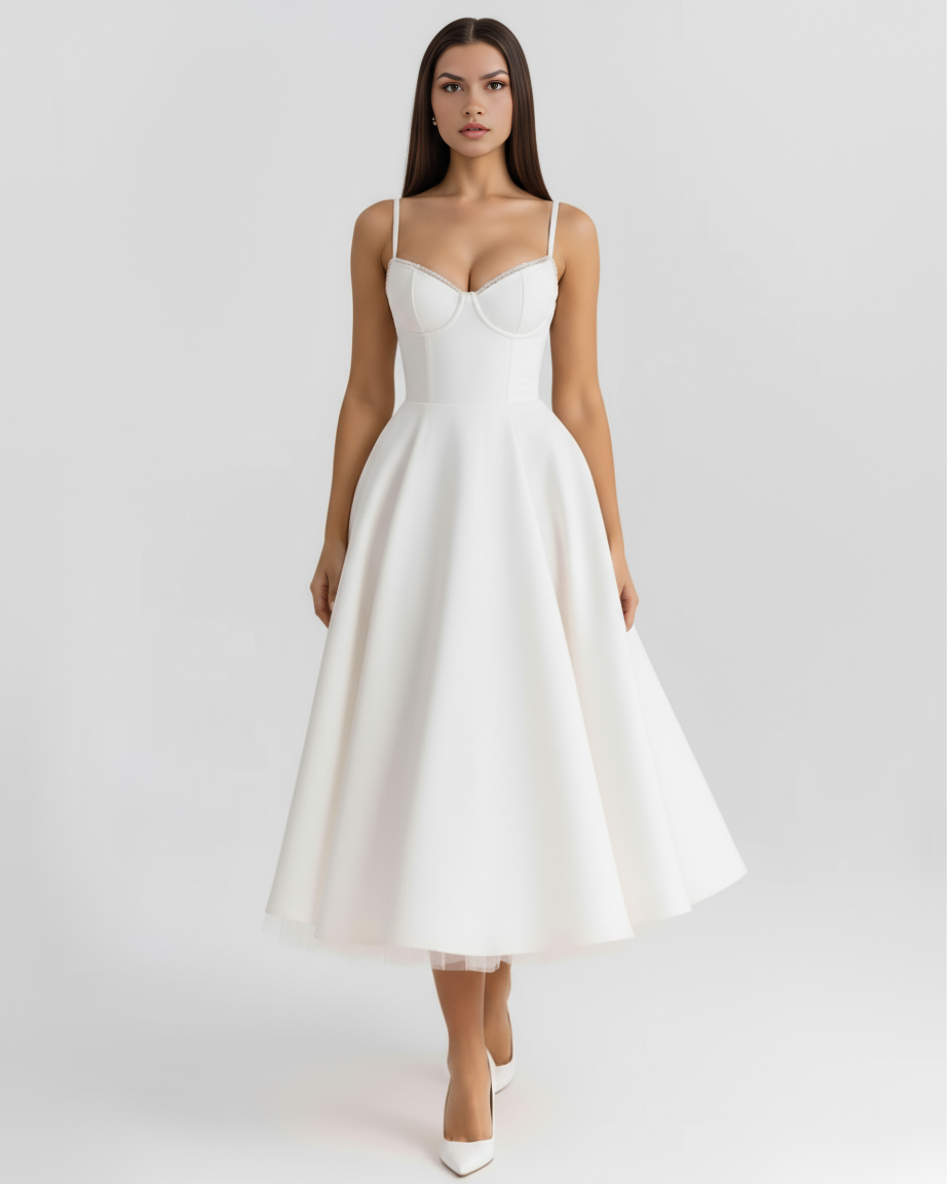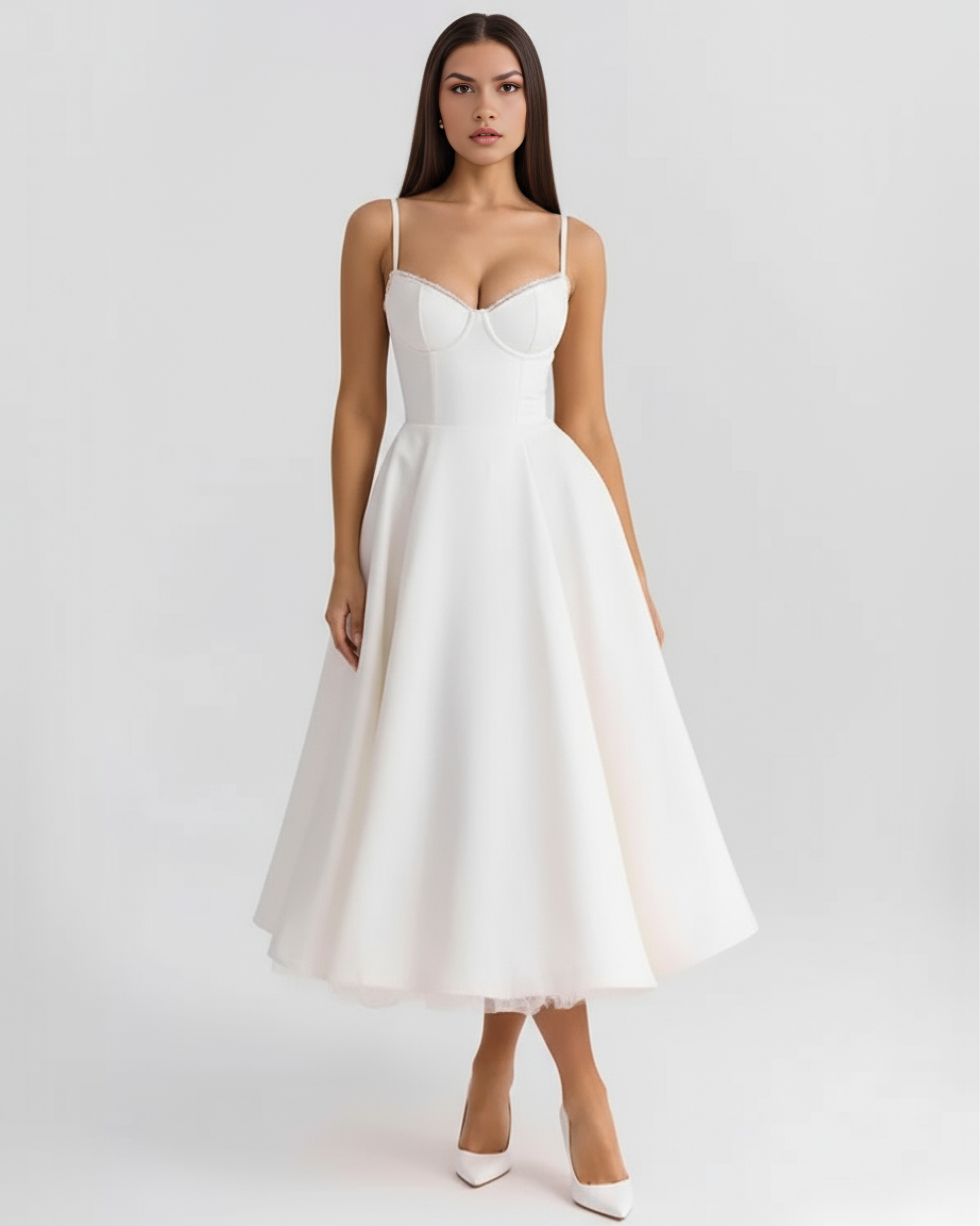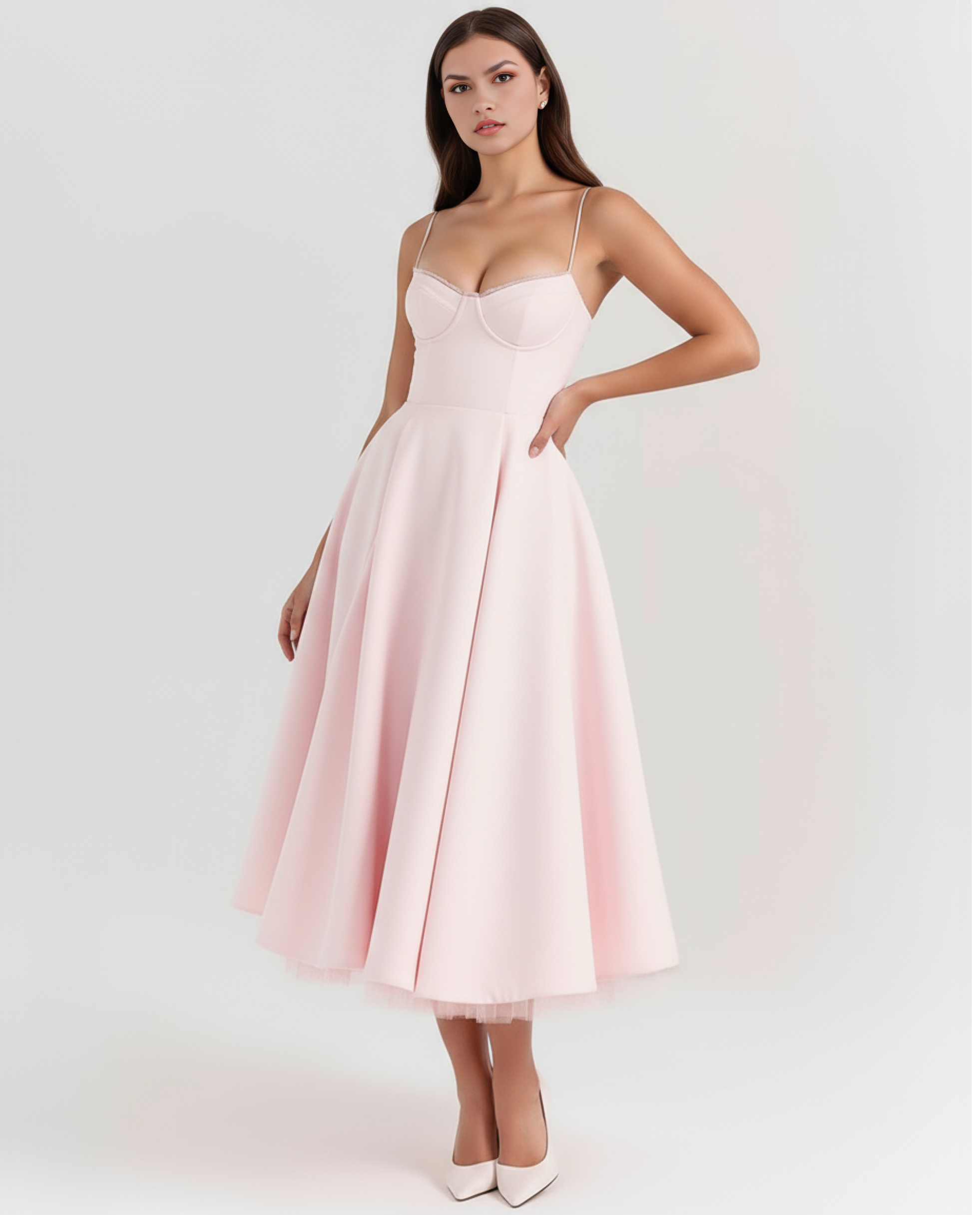 Confeccionado con un tejido brillante con tacto satinado y un toque de malla elástica, nuestro vestido midi «Selene Grace» es digno de un cuento de hadas. El corpiño está perfectamente entallado para realzar la cintura y tiene un bonito escote corazón con copas con aros. Los delicados tirantes se ajustan para un ajuste perfecto y «Selene Grace» destaca por su falda midi vaporosa, con una voluminosa capa de tul muy suave para un look impresionante que mantiene la forma a la perfección.