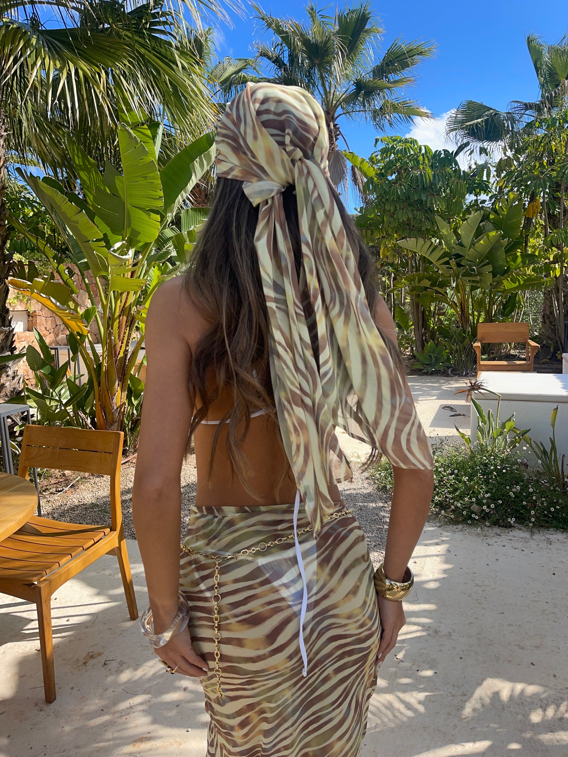 Ideal para llevar al cuello, en el cabello, como detalle en bolsos o para completar looks de playa y vacaciones, esta bandana es una pieza versátil y llena de estilo. Un accesorio sencillo pero impactante, pensado para dar personalidad y color a tus outfits de temporada.