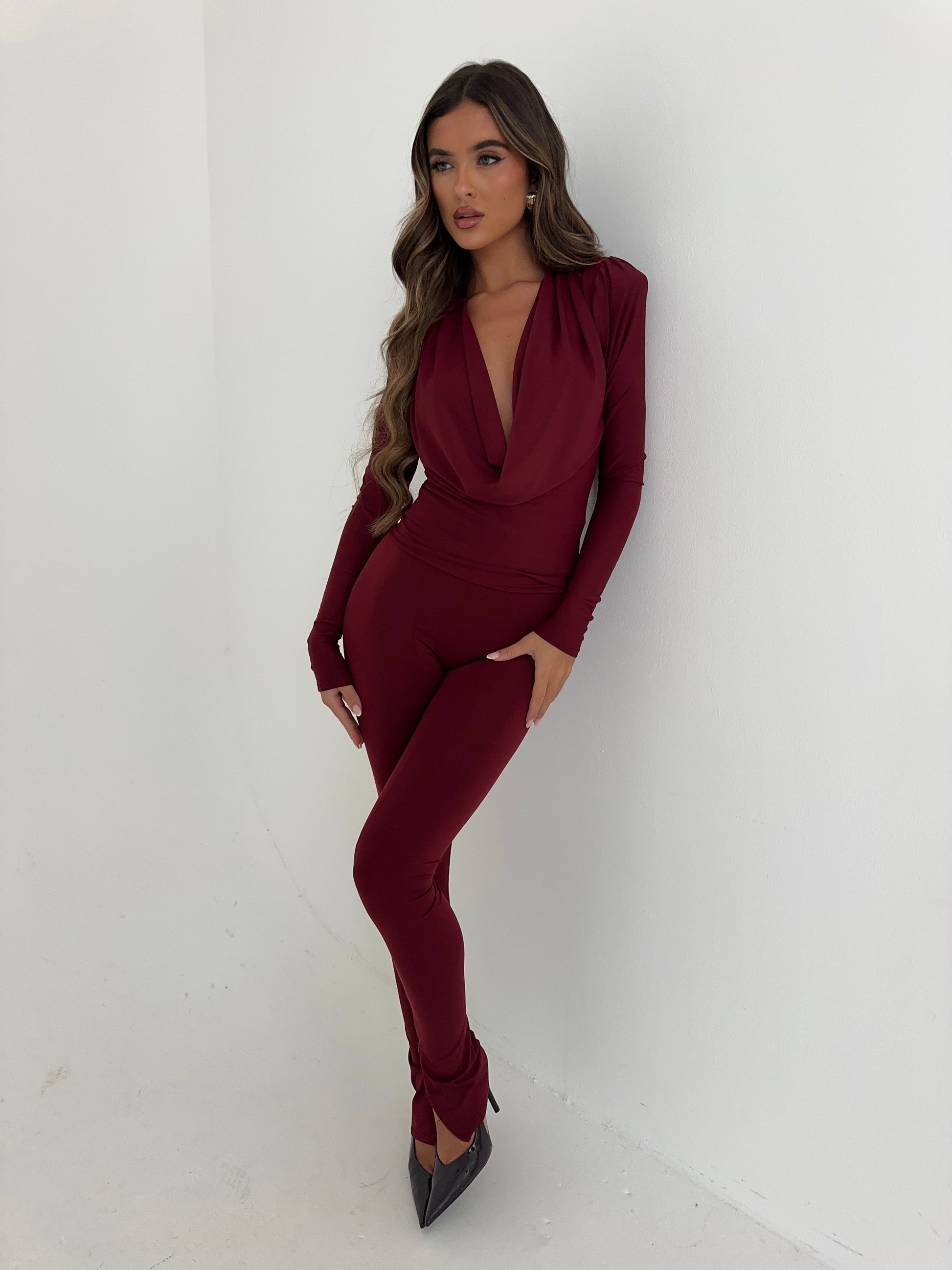 Los Leggings Jolie Split Hem en Borgoña de SOFIACALDERON combinan un diseño estilizado con un toque moderno y sofisticado. Su corte ceñido realza la silueta, mientras que el detalle de abertura en el bajo aporta un acabado elegante y actual.